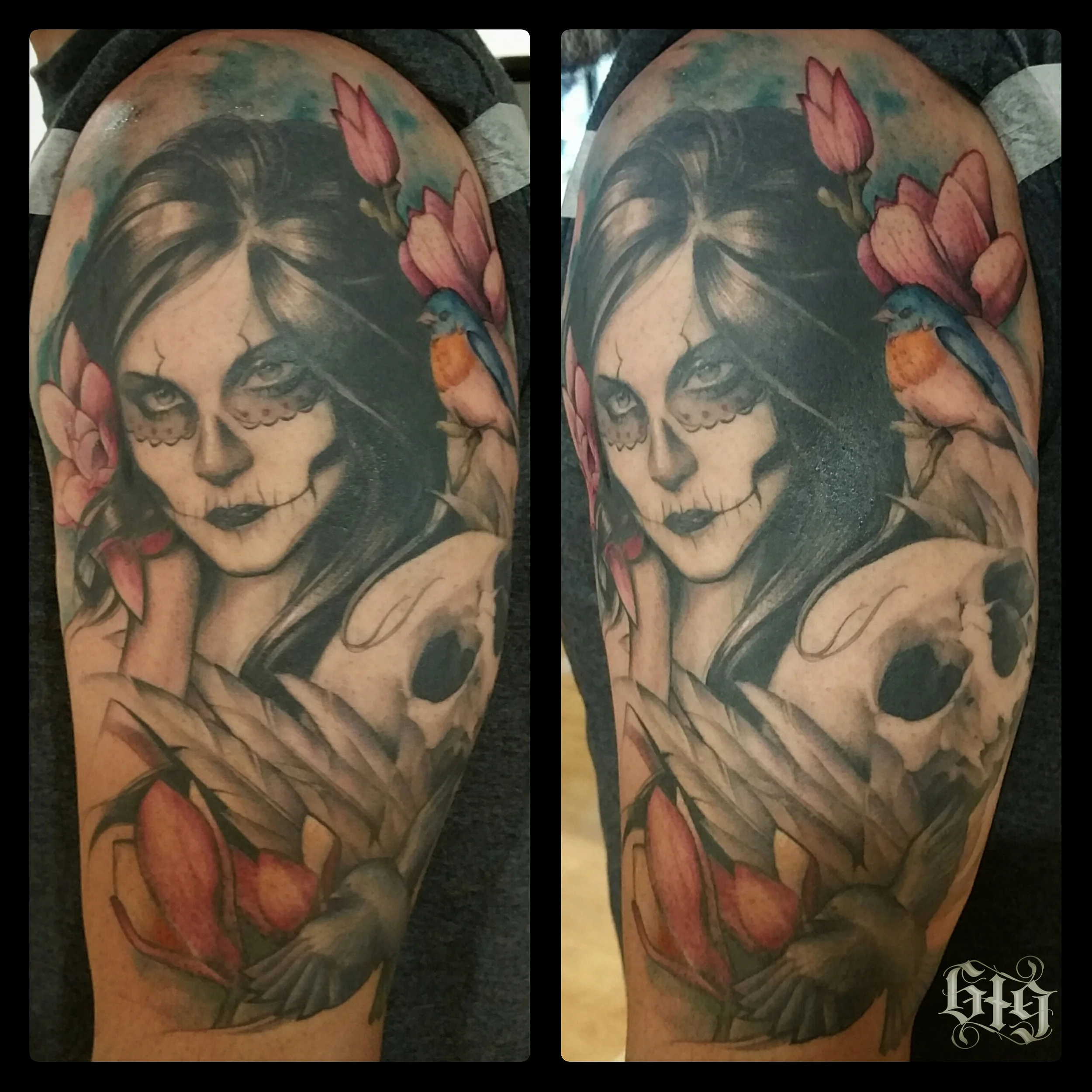 Day of the Dead Sugar Skull Pinup with red breasted blue birds, feathers and skull. Half sleeve tattoo full black and gray with color.