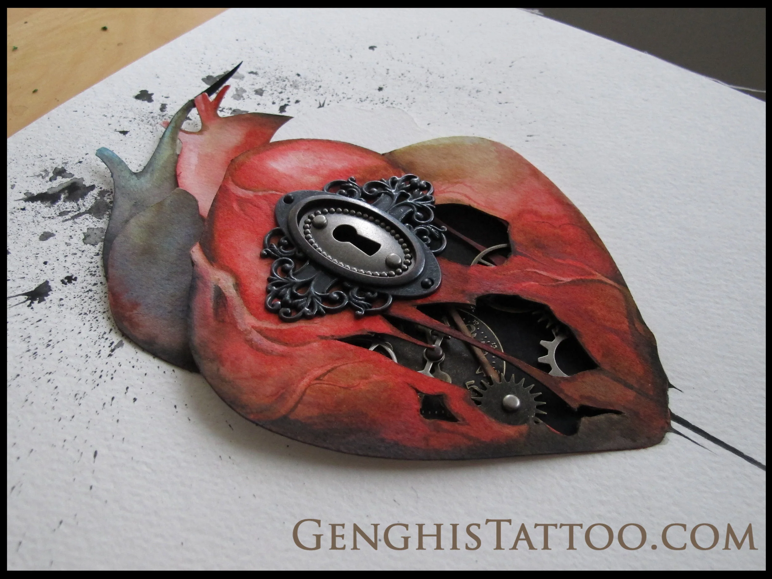 Original Artwork watercolor on paper. Steampunk heart with gears and lock