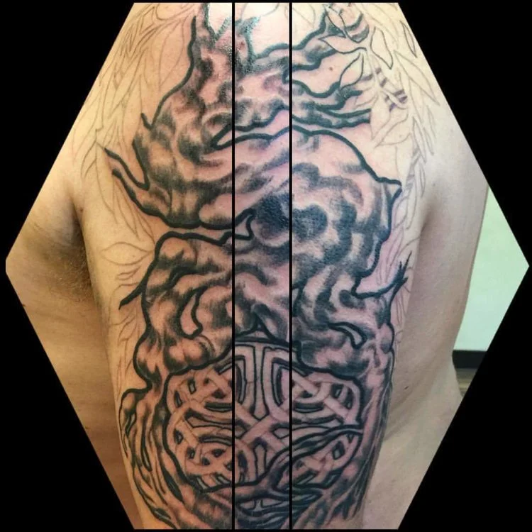 Celtic knot in the roots of a tree. In Progress Black and gray.