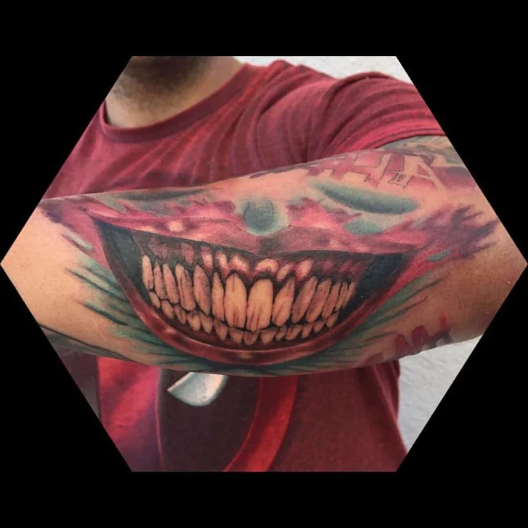 Realistic teeth of a Cheshire cat laughing in color tattoo