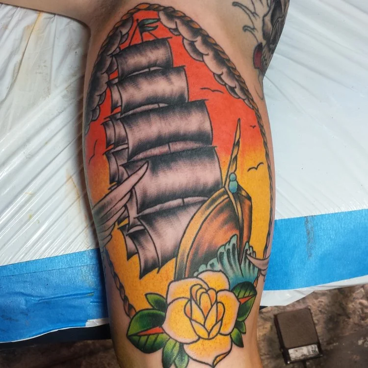 Clipper ship and rose, nautical naval themed half sleeve tattoo in progress.